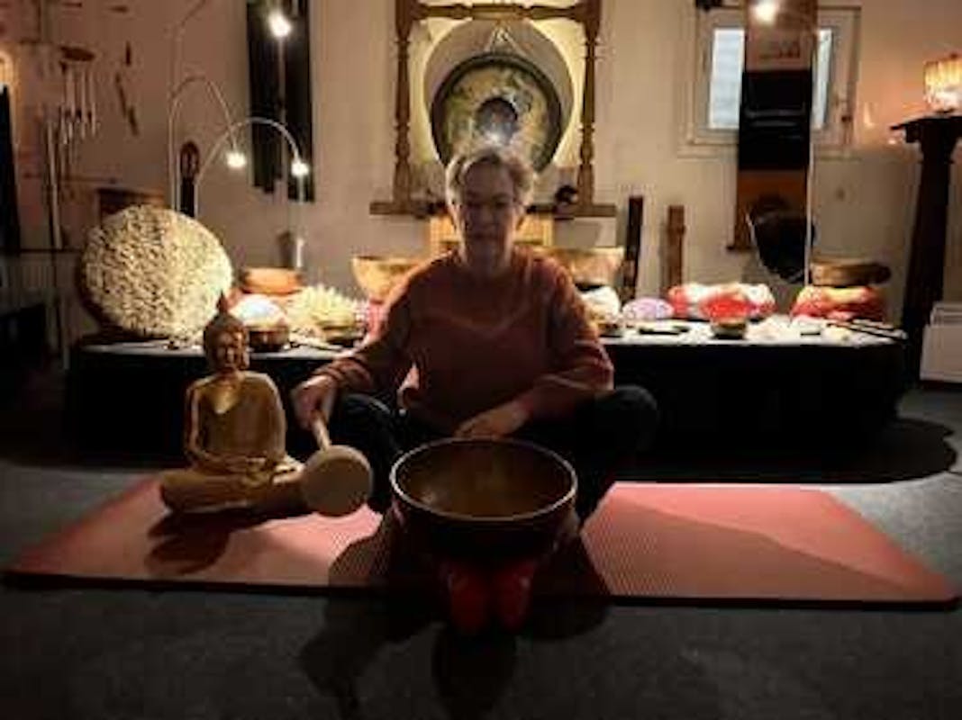 Truus neemt je op een intuïtieve wijze mee in de wereld van de klankschaalsessies.