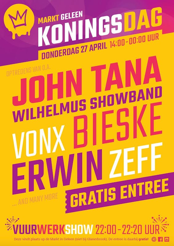 Onze koning is bijna jarig en dat moet gevierd worden. Op de Oude Markt komt een muziekpodium te staan waar diverse artiesten zullen zorgen voor een โfeestelijkeโ line-up. De line-up bestaat uit o.a. John Tana, Erwin, Bieske, de Wilhelmus showband en de lokale DJโs ZEFF en Vonx. Het muziekprogramma start om 14.00u en eindigt om 00.00u en is gratis te bezoeken.