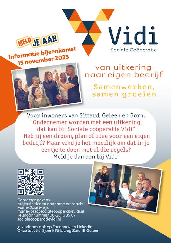 Nieuwsgierig geworden? Kom naar onze informatiebijeenkomst op 15 november in Sjoenk, Rijksweg Zuid 1b hier in Geleen. Van 10u tot 12u of van 13.30u tot 15.30u. Kijk voor meer uitleg en aanmelden op onze websiteVidi Voorkant flyer informatiebijeenkomst 15 november.pdf Zien we je daar? Je bent van harte welkom!