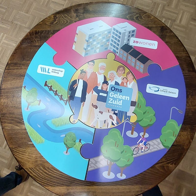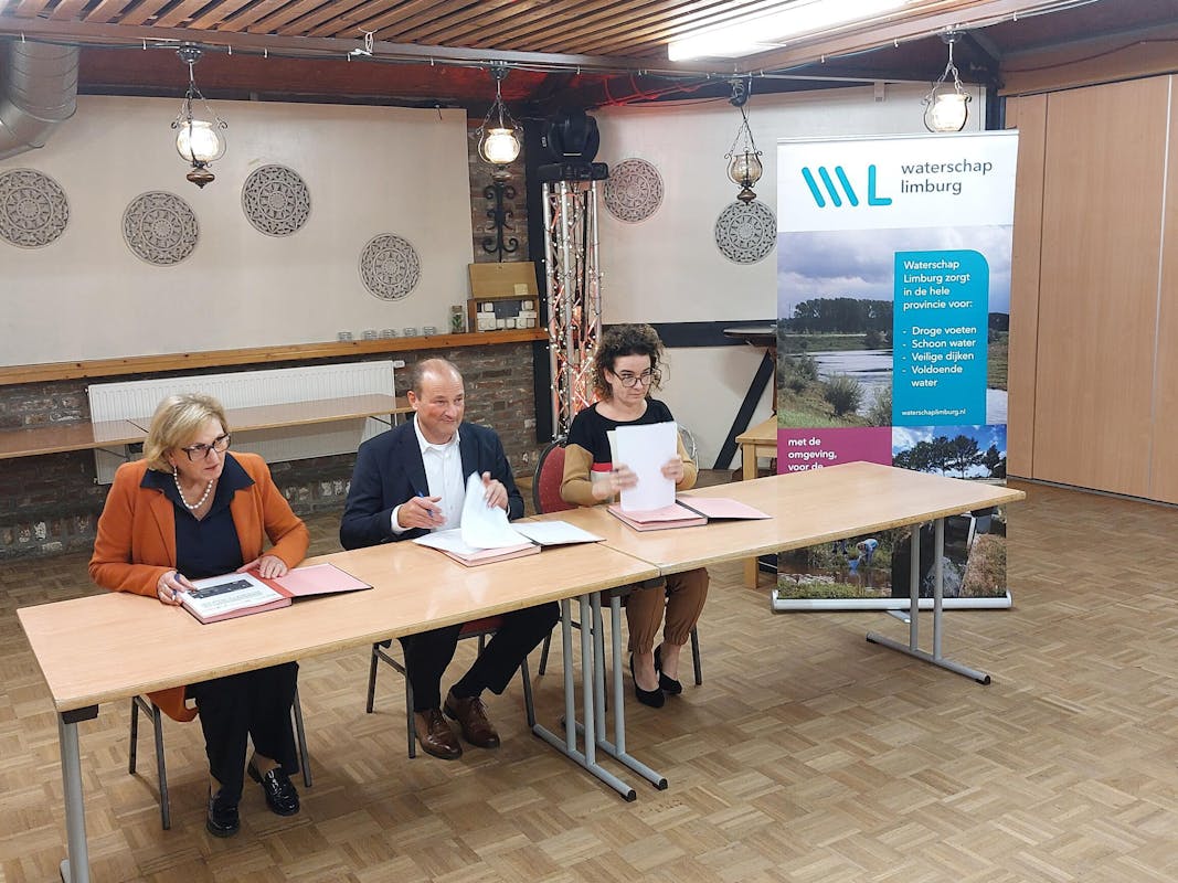 Symbolisch pasten waterschapbestuurder Josette Van Wersch, wethouder Leon Geilen en Janine Godderij, bestuurder van ZOwonen, de stukken van de legpuzzel in elkaar.