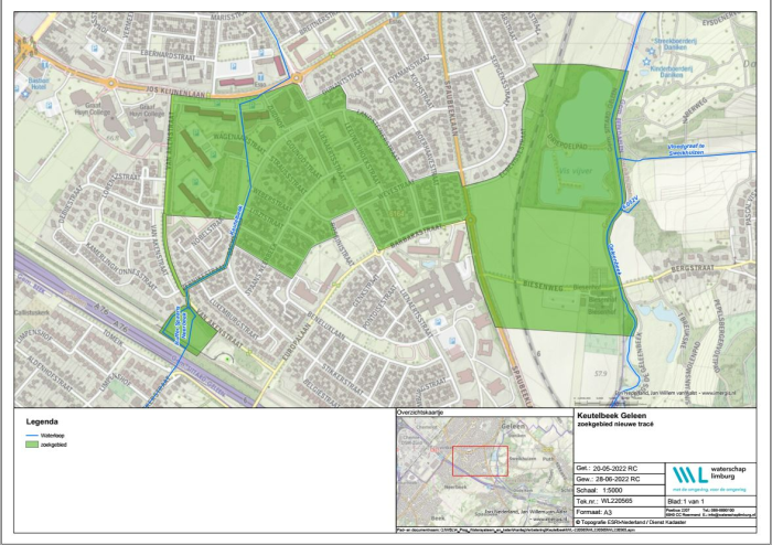 Het kaartje toont het beoogde tracé en zoekgebied van de ontkluizing Keutelbeek Geleen.