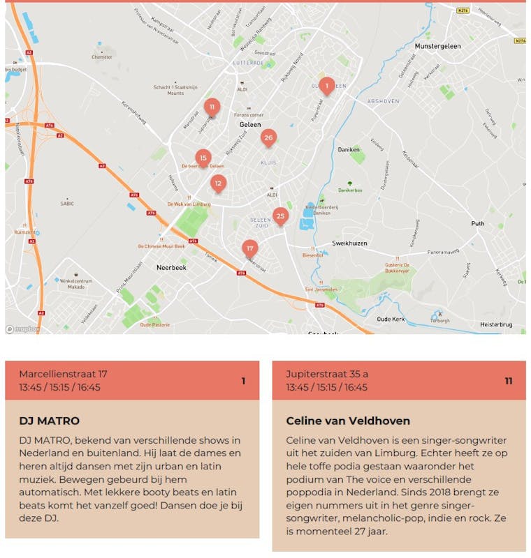 Op zondag 2 juli tussen 13:00 en 18:00 uur vinden optredens plaats in 31 tuinen in Sittard-Geleen. Bezoekers kunnen van optreden naar optreden wandelen of fietsen en leren zo de wijk kennen, genietend van lokale podiumkunsten.