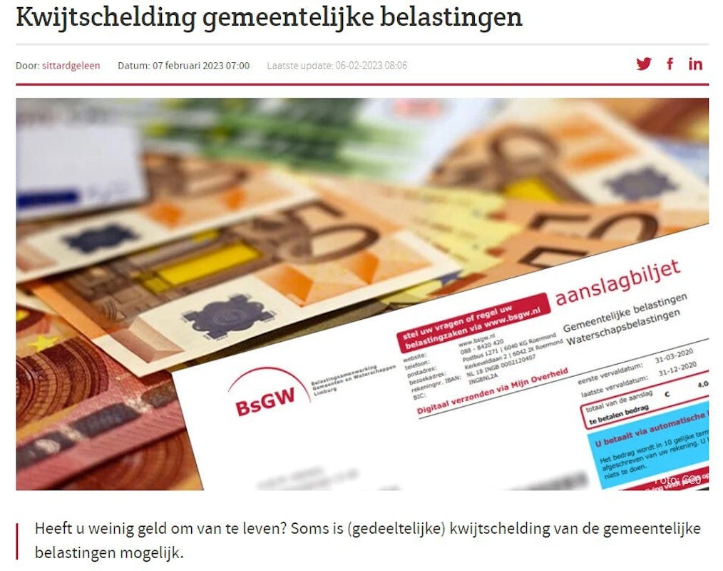 De voorwaarden kunnen per gemeente verschillen. Ga voor meer informatie naar de website van de BsGW (Belastingsamenwerking Gemeenten en Waterschappen Limburg) en zoek op ‘Kwijtschelding’. U kunt BsGW op werkdagen van 09:00 tot 17:00 uur ook bellen op het telefoonnummer 088-8420420.